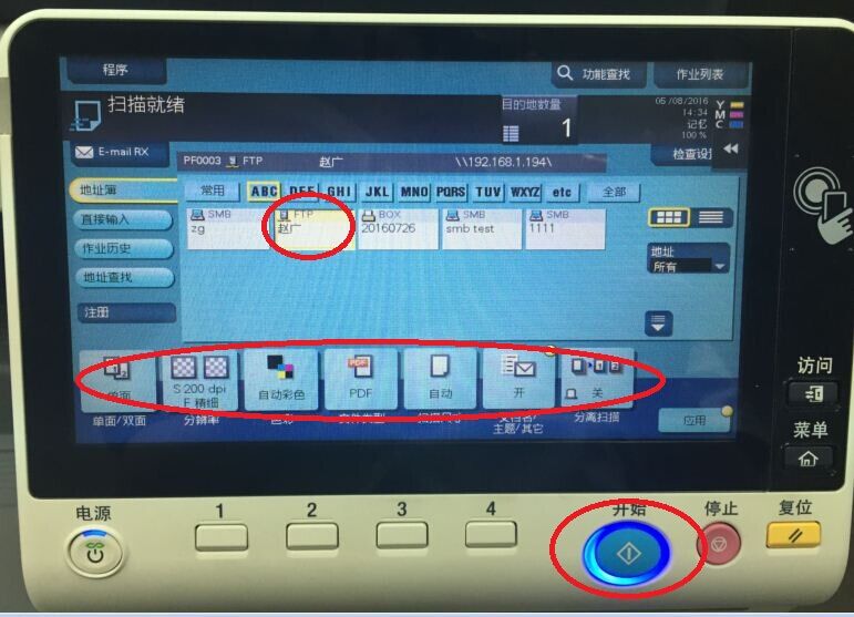 5)選中之前所創(chuàng)建的FTP項(xiàng),設(shè)置好掃描需求后點(diǎn)擊右下方發(fā)光的藍(lán)色開始鍵,回到電腦設(shè)置的文件夾中查找對(duì)于圖像即可