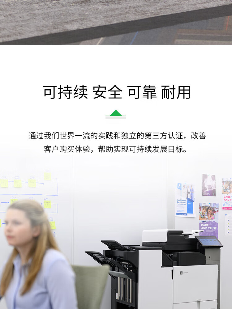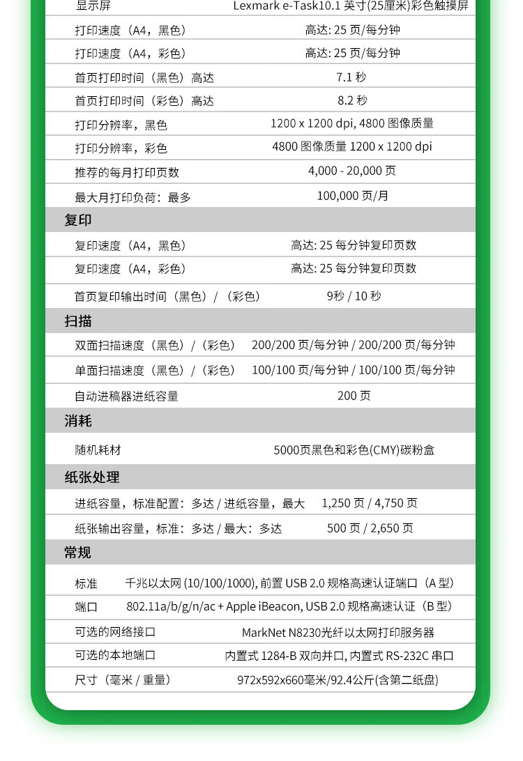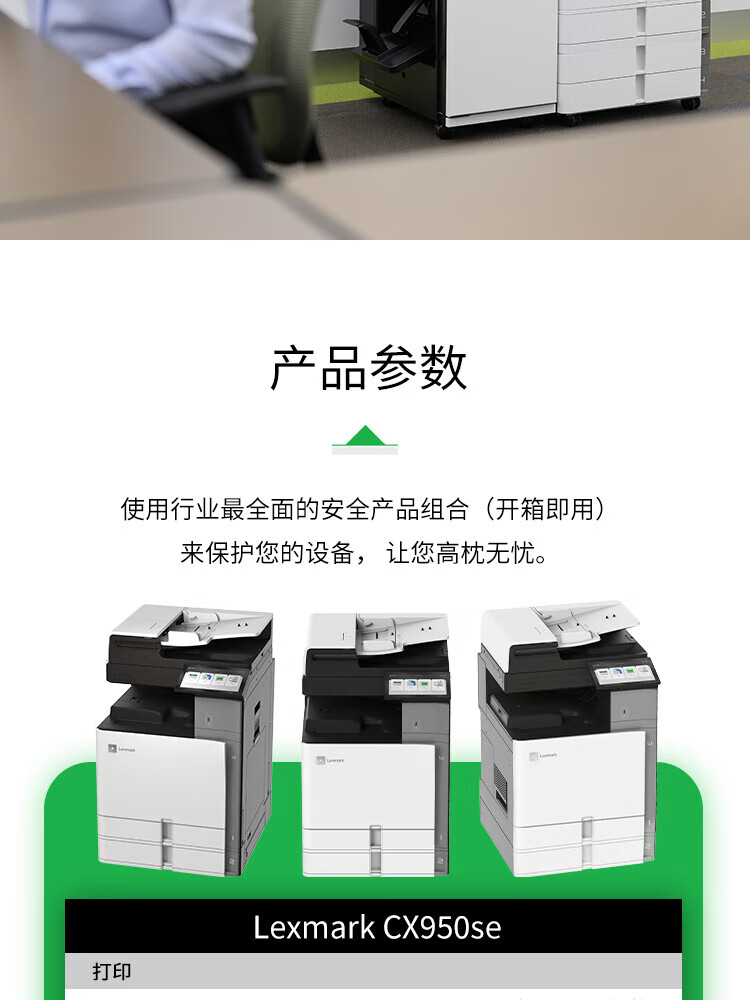 全新 利盟 (Lexmark ) CX950se彩色多功能一體機融合尖端科技,以安全可靠的多功能性、優(yōu)異卓越的可持續(xù)性和超乎想象的易用性,為您開啟 A3 多功能打印的新篇章。逼真的打印效果,最高 25 頁/分鐘* 的打印速度,助您多快好省完成工作。25 厘米彩色觸摸屏直觀易操作,單通道雙面掃描輕松省時間。